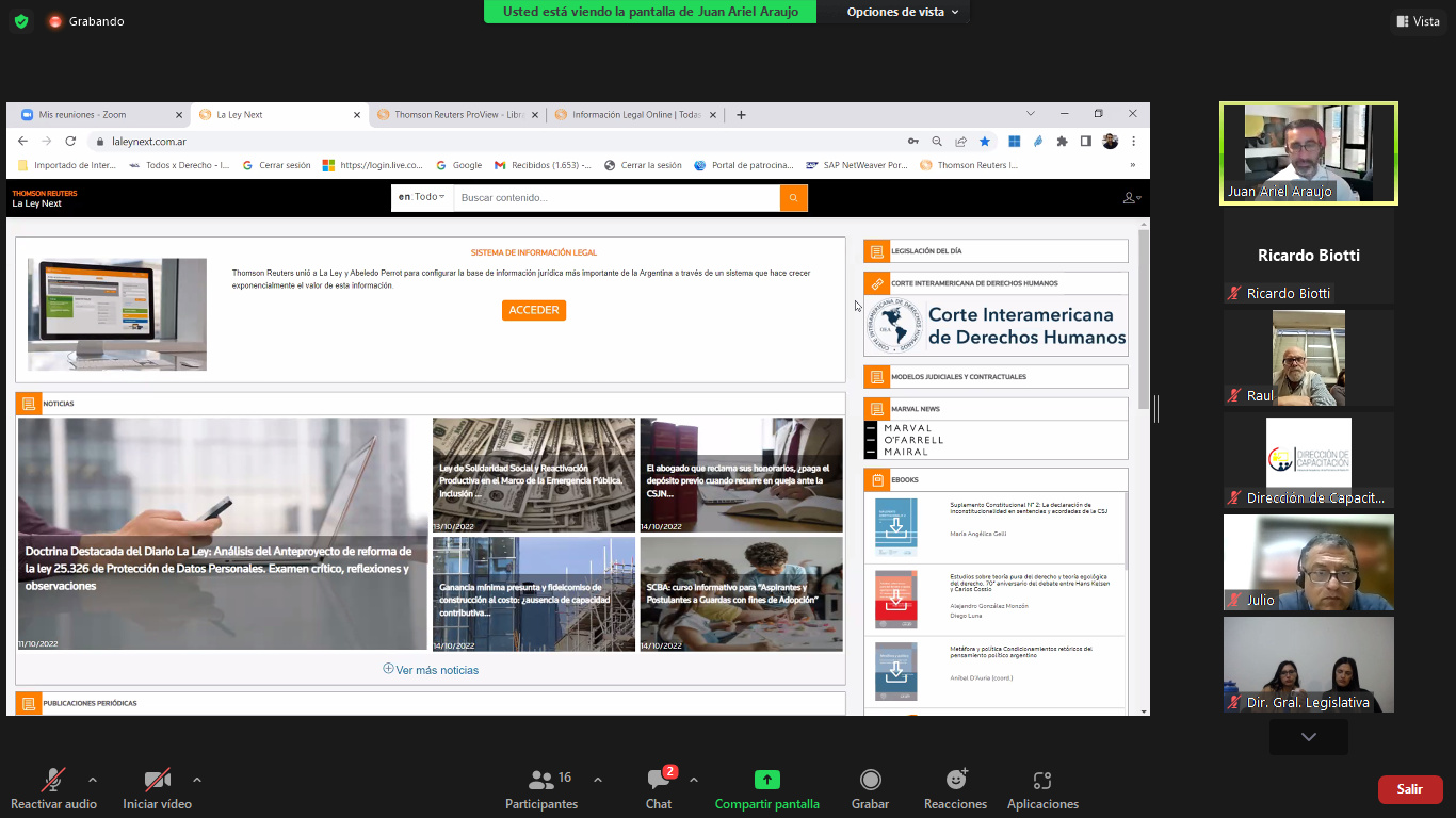 El viernes 14 de octubre del corriente, se realizó una capacitación referida a actualización y uso de la plataforma Thomson Reuters (La Ley), la cual estuvo dirigida a una serie de oficinas de la Cámara de Senadores y de la Cámara de Diputados que tienen acceso con clave al sistema on-line de dicha plataforma.