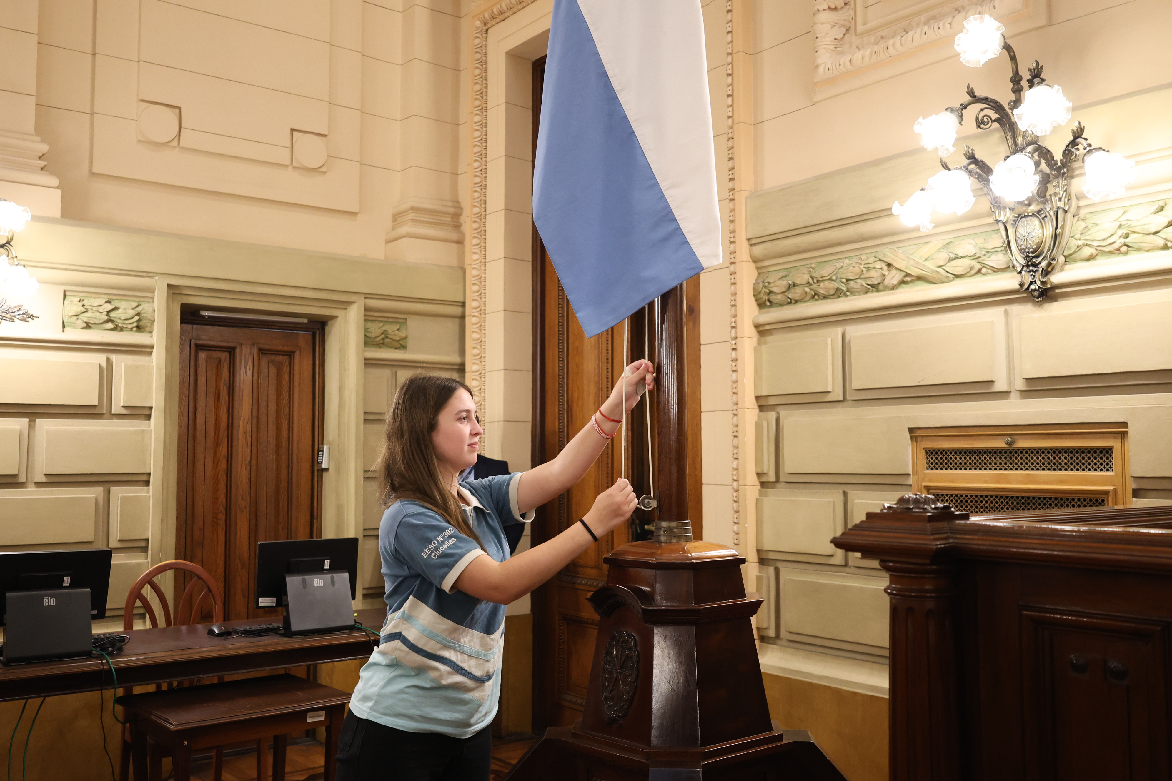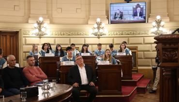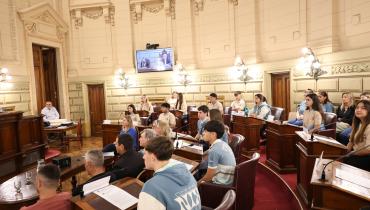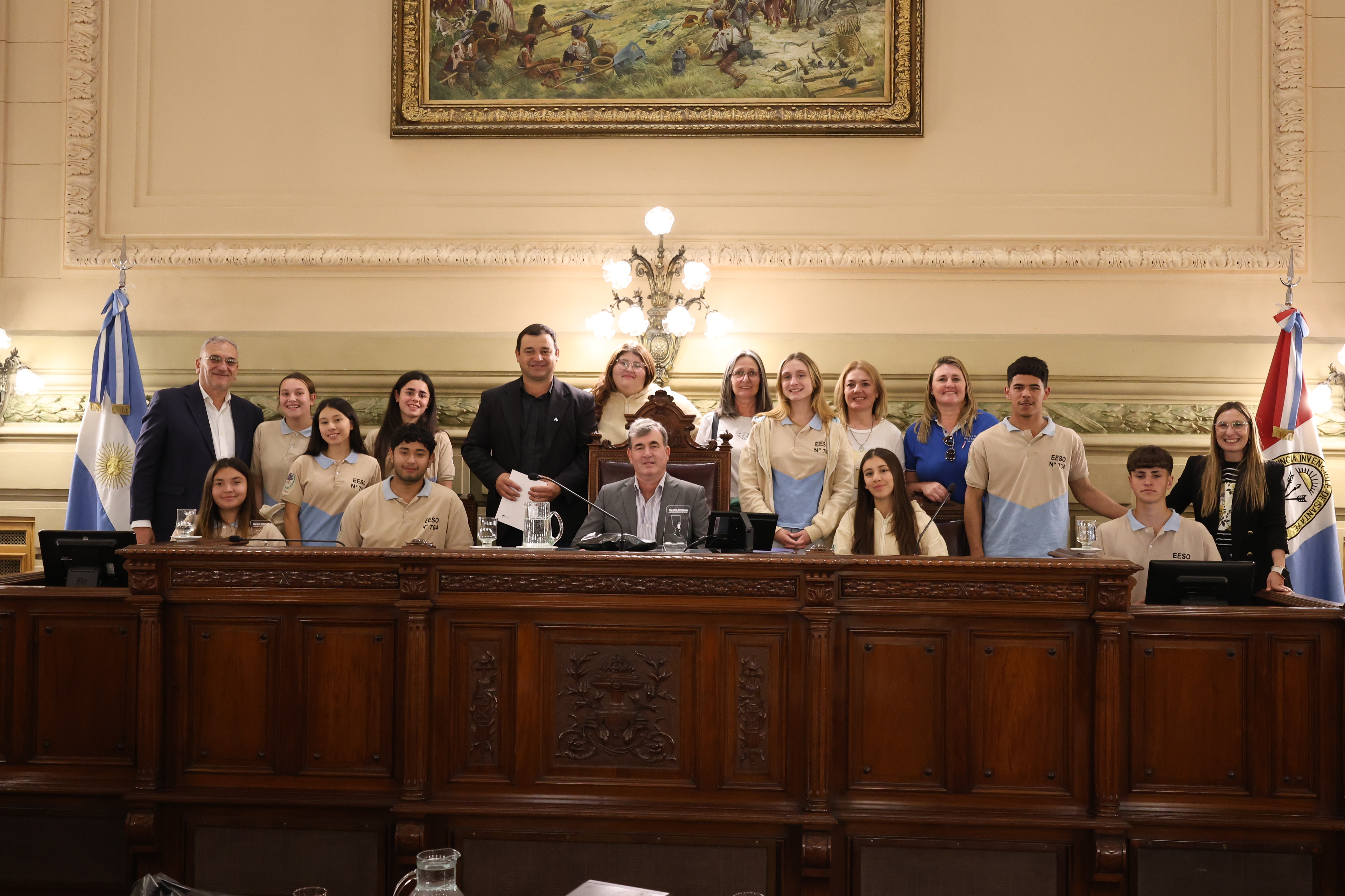 Estudiantes de la EESO N° 704 de Villa San Jóse y EESO N° 302 "Aaron Castellanos" de Plaza Clucellas, departamento Castellanos, participaron de una sesión simulada en el marco del programa Ciudadanos en el Senado, presidida por el senador Alcides Calvo.