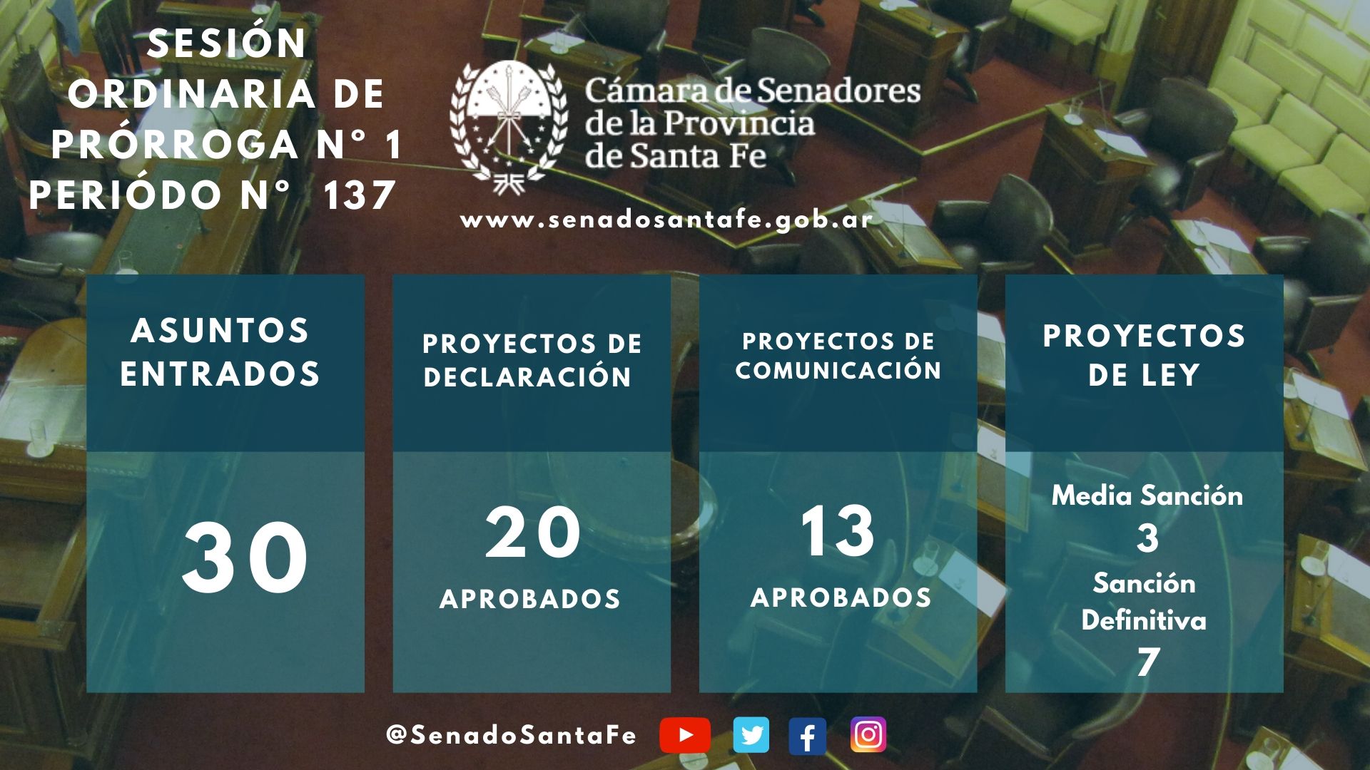 En el recinto de la Cámara de Senadores se llevó a cabo la Sesión Ordinaria de Prórroga N° 1 del Período N° 137. La misma fue presidida por el vicegobernador Carlos Fascendini.